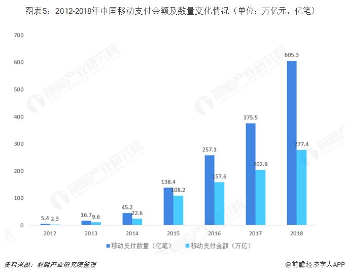 據中國支付清算協會最新數據顯示,2017年,中國移動支付規模達202.93萬億元,全球排名第一,近五年移動支付規模年復合增速高達117.6%;2018年,中國移動支付業務605.3億筆,金額277.4萬億元,同比分別增長61.2%和36.7%。